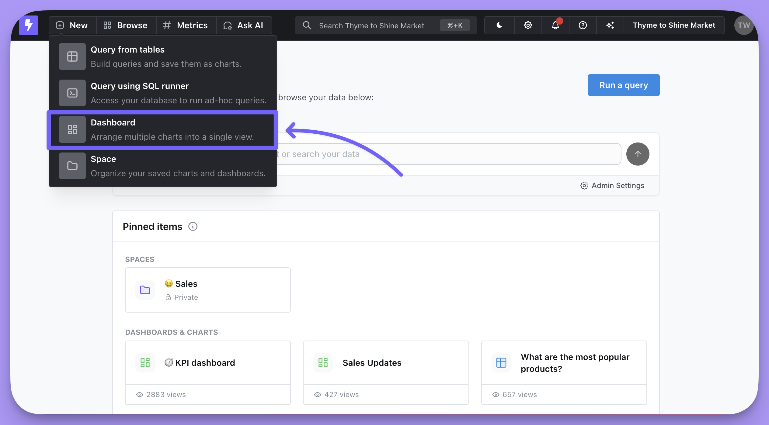 Dashboards allow you to arrange multiple charts that are related to each other into a single view. The process for creating dashboards is as follows: