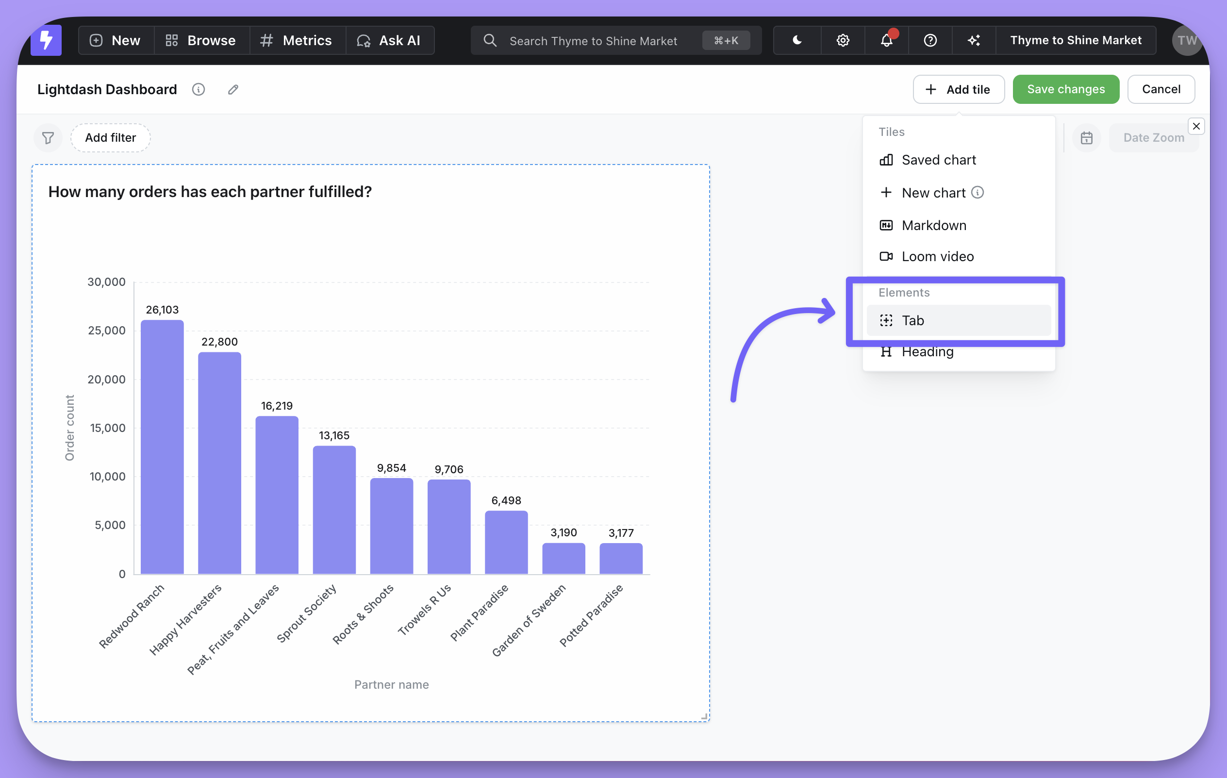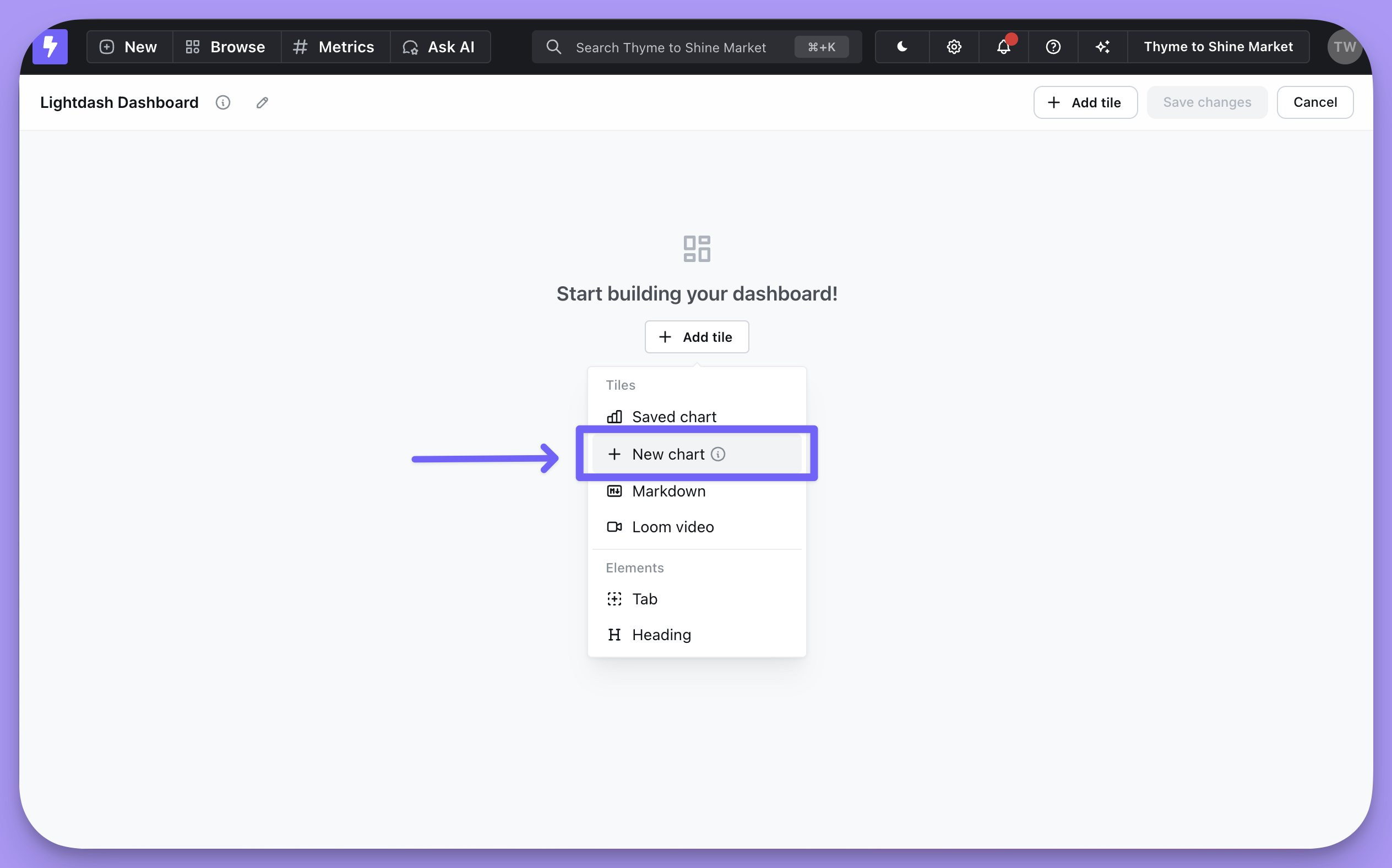 You can add an existing chart to your dashboard by clicking “Add tile” and then “Saved chart”. Clicking any chart will add it at the bottom of your dashboard.