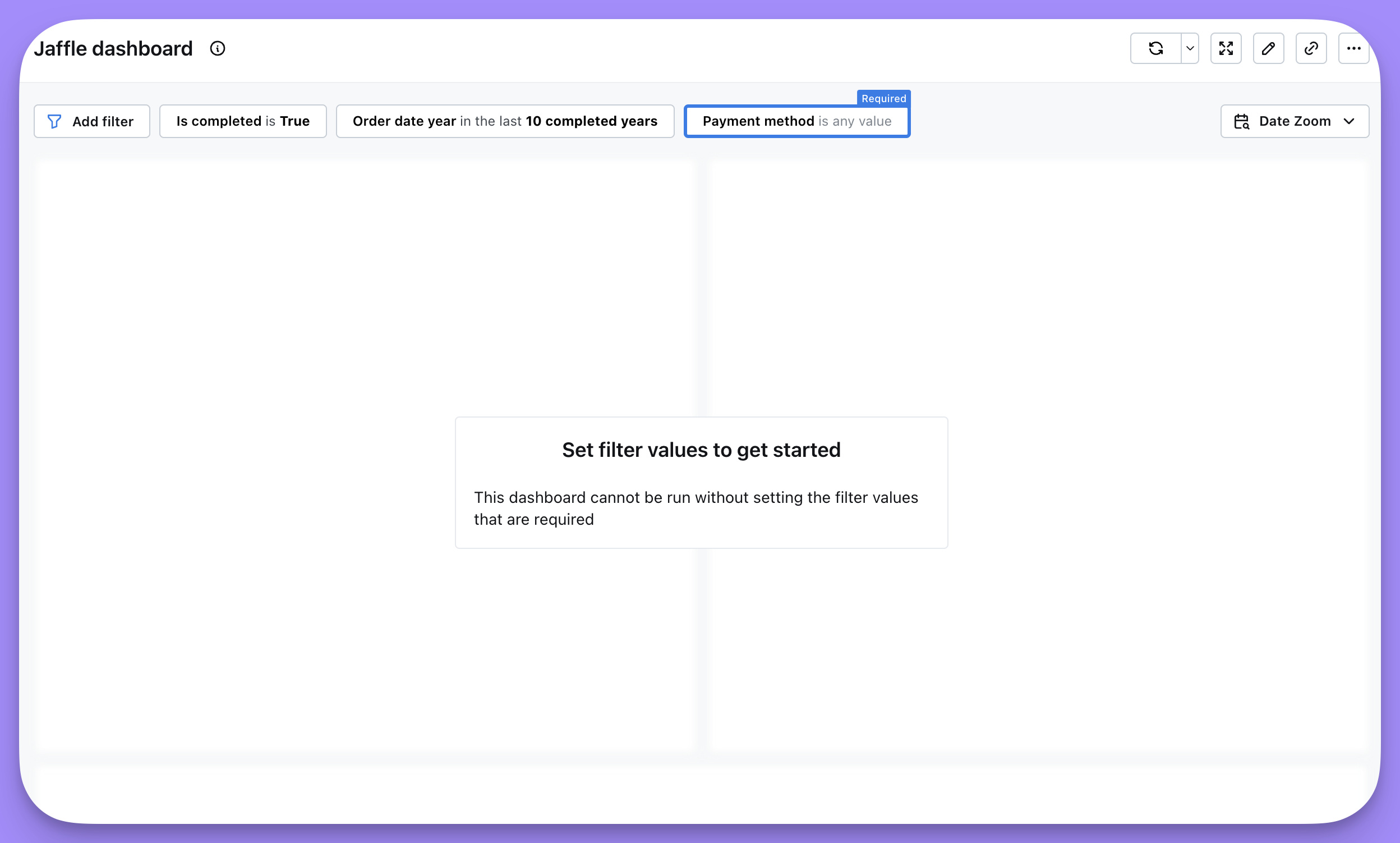You might want to add an empty-value filter so that your dashboard viewers can choose their own value and explore the data based on their own criteria. Your dashboard viewers might also want to add their own filters to your dashboard.