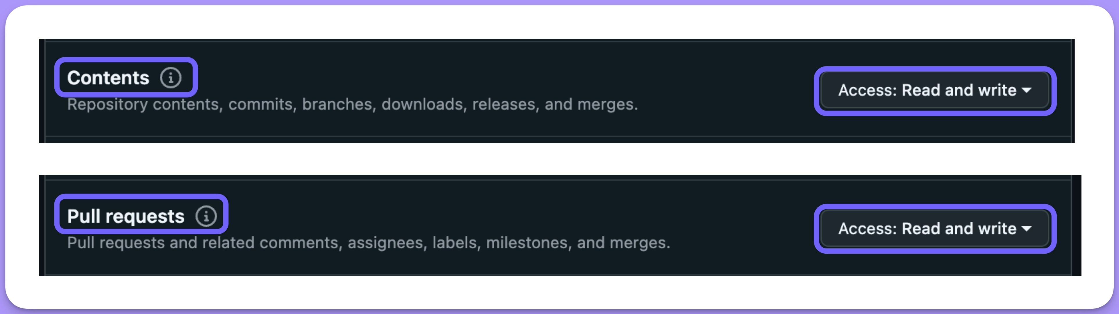 Repositorypermissions, selectContents—>Read and WriteandPull Requests—>Read and Write.