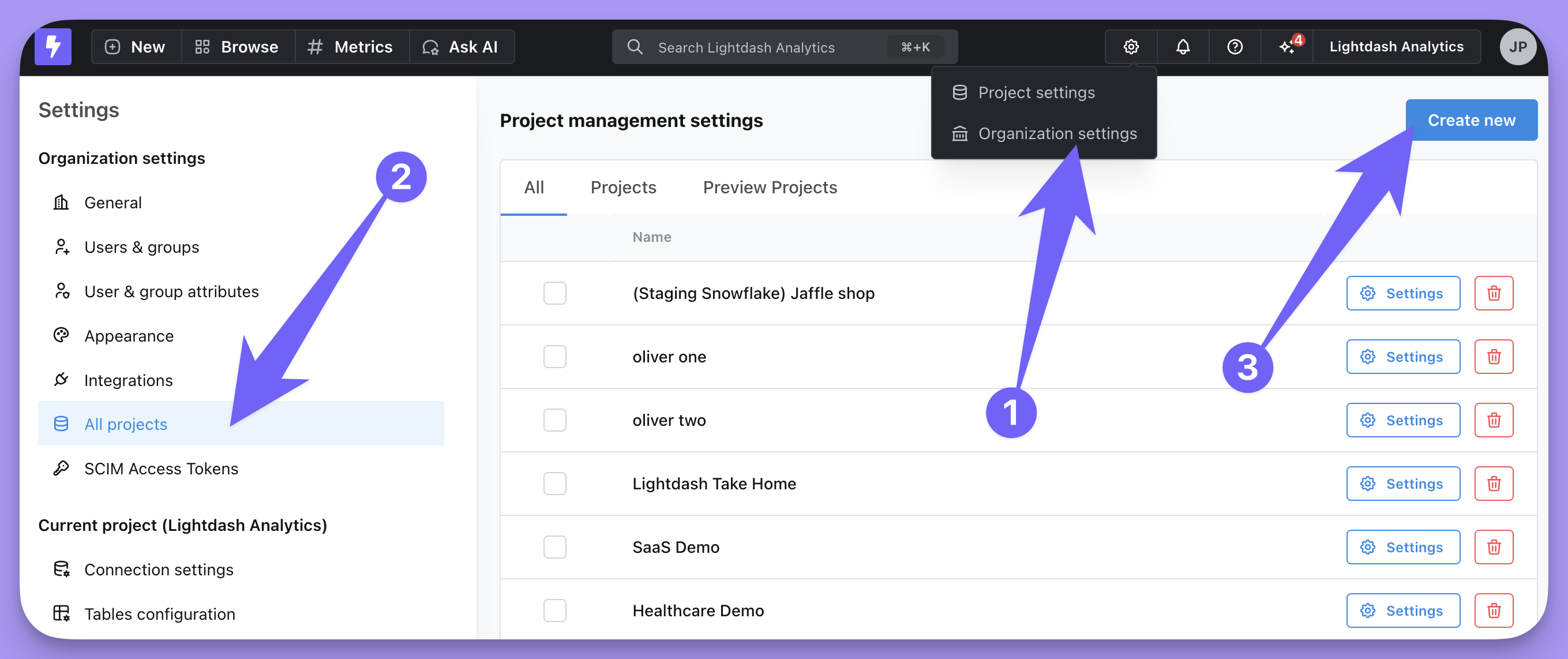To update an existing connection, go to Project settings by clicking on the gear icon in the top-right navigation.