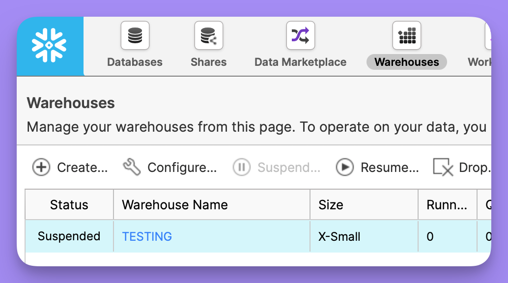 This is the name of the warehouse you would like to use for running queries. The specified user must be grantend access to use this warehouse. You can see al list of warehouses available in the snowflake console:
