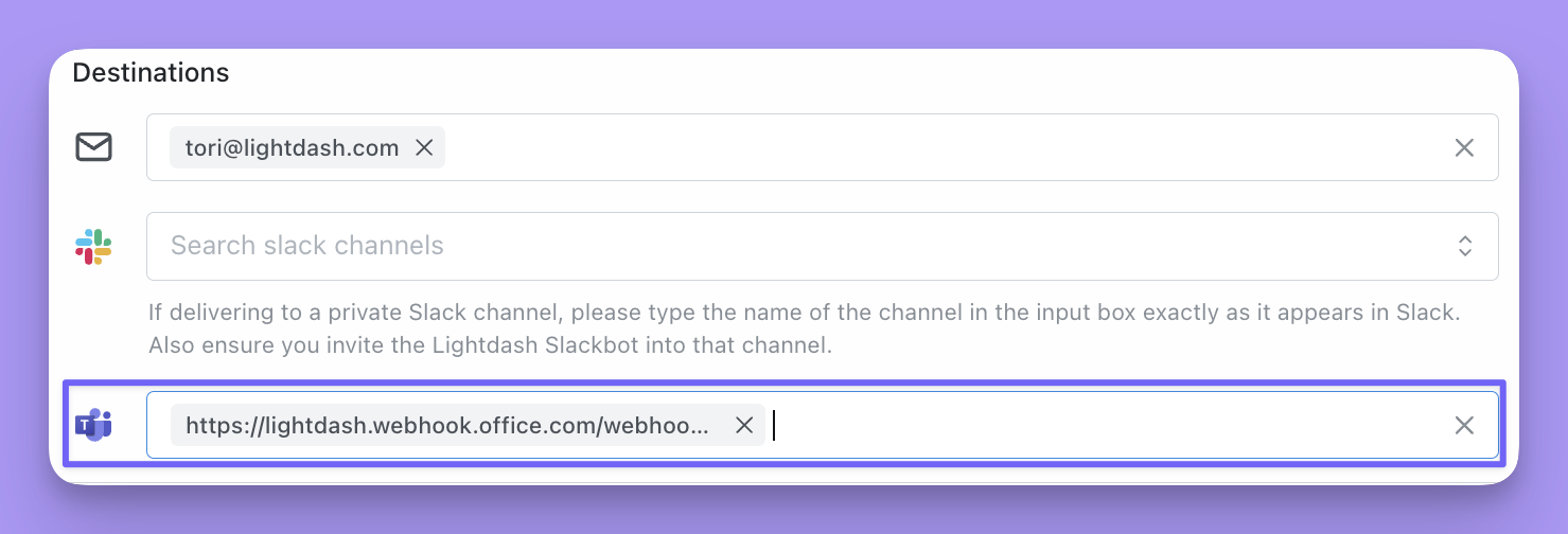 You can send your Lightdash scheduled deliveries directly to Microsoft Teams using incoming webhooks. This allows you to keep your team updated with key metrics and reports, right inside your Teams channels.🔗 How to Create a Webhook in Teams