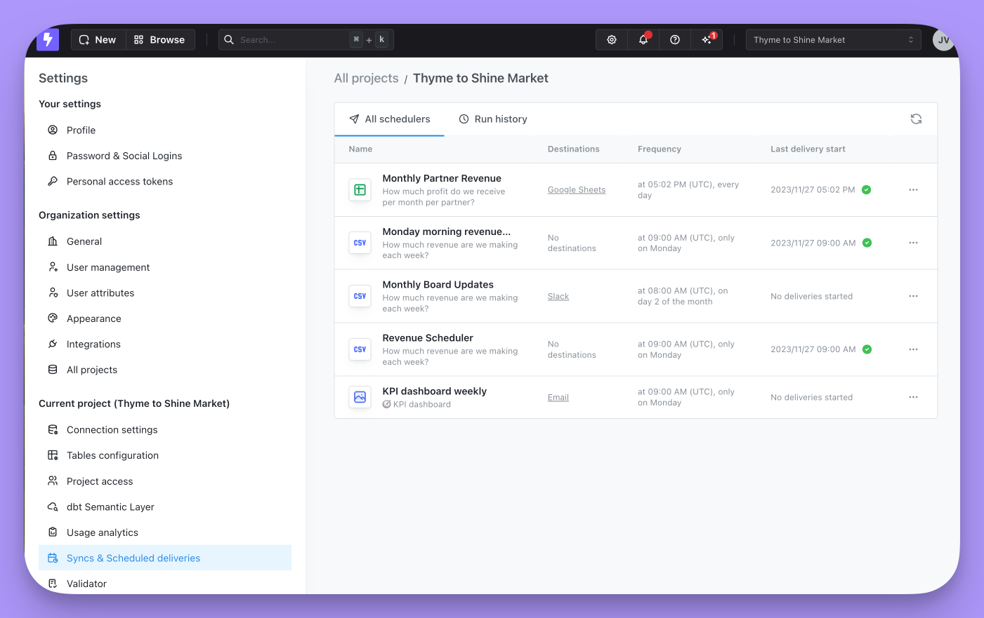Users who have an admin role in your project can access an overview of your scheduled deliveries in the project settings. In the scheduled deliveries overview page, you can see a list of all of your scheduled deliveries, their most recent delivery status, and a history of all of the previous scheduled deliveries in your project. To access the overview page, just head to your project settings, then to theSyncs & Scheduled Deliveries tab.