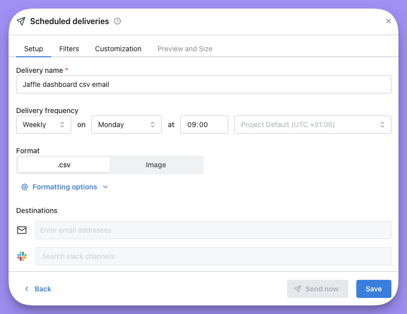 You can choose if you want to send your scheduled delivery to Slack, email, or both. You can add as many Slack channels and email addresses as you’d like to here. You can send a scheduled delivery to a person in Slack using@persons-name or to a channel using #channel-name.