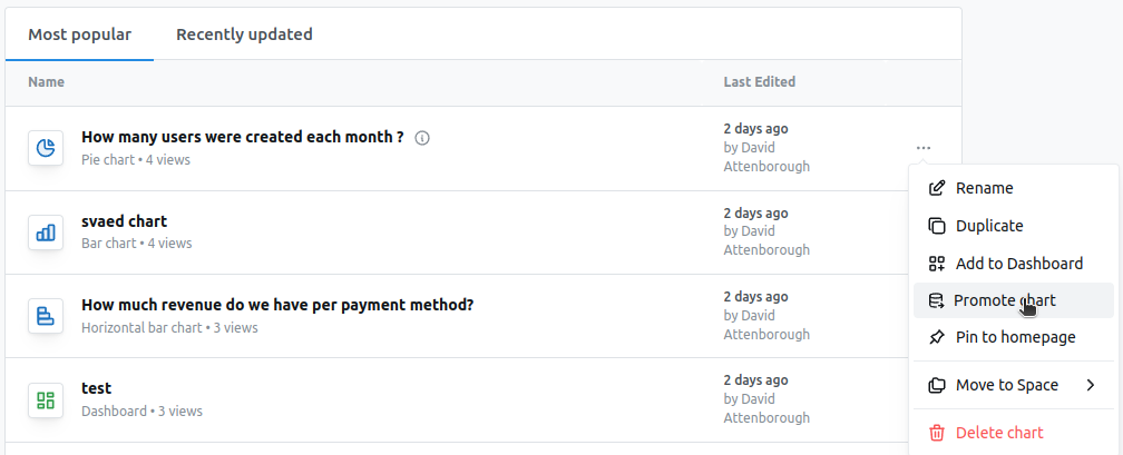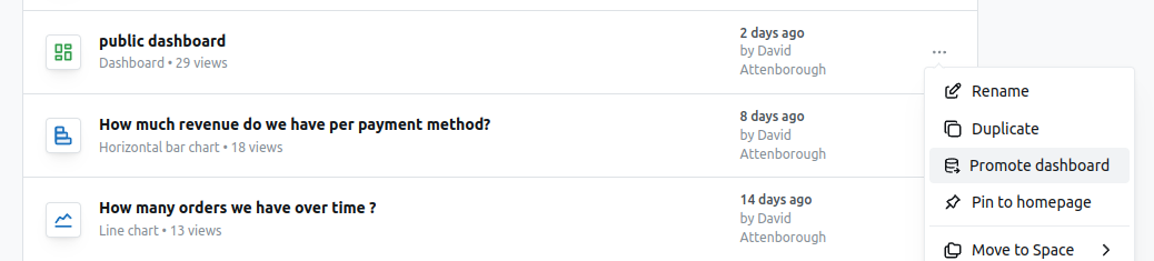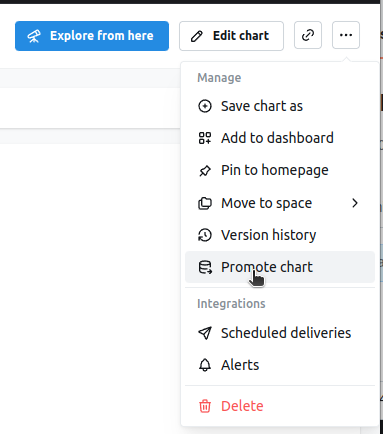 You can promote dashboards from the dashboard in view mode or from any listing (like home page or all dashboards), click on the ... button and then select promote dashboard. This will promote the dashboard to the upstream project as well as all the charts in this dashboard (for both charts within spaces and charts within this dashboard) and all other non-chart tiles like markdown. If the dashboard or charts are in a space that doesn’t exist in the upstream project, then these spaces will be created and the content will be put in these spaces.