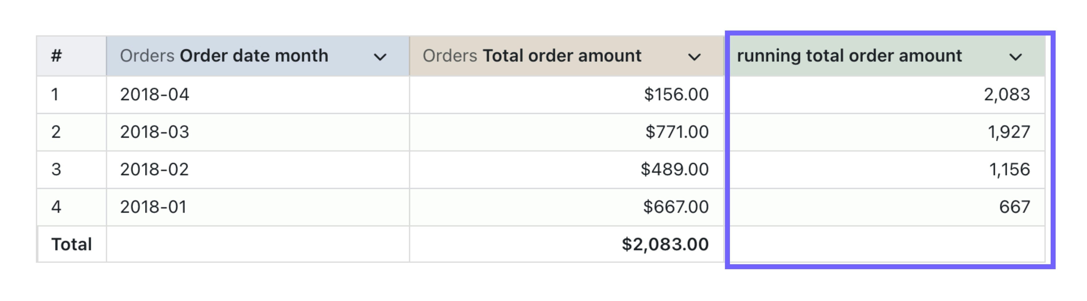 column_I_want_to_sum- this is the column with the values you want to add upcolumn_I_want_to_order_by- this is the column you want to order your running total overoptional_other_column_I_want_to_order_by- this column is optional and you can add as many moreorder bycolumns as you need. For your running total to only go up an increment of one row, youโll need to add every dimension in your results table to theORDER BYbit in your SQL. And, the order of these will need to be the same as the ordering youโve added to the columns in your results table.