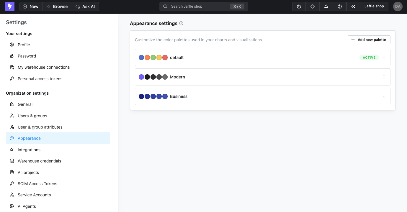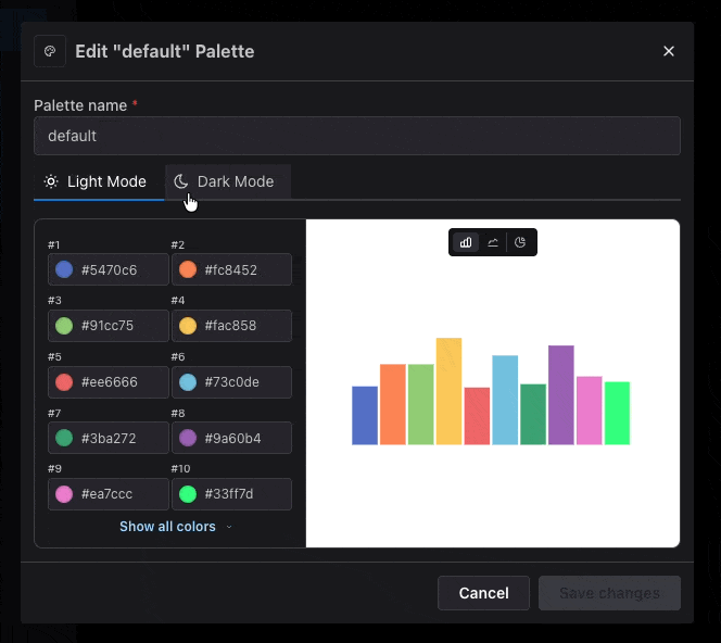 You can configure different color palettes for light mode and dark mode to ensure optimal contrast and readability in each theme. The appearance configuration includes separate tabs for both light mode and dark mode, allowing you to customize color schemes for each theme independently. Since dark mode is available as a user preference setting within the app, having separate palettes ensures your charts look great regardless of which theme users choose. Note that dark mode is only available when using the app directly - embedded charts, Slack integrations, and other external integrations will continue to display in light mode.